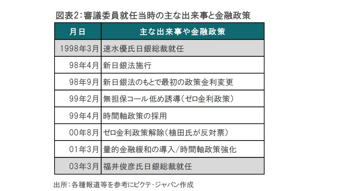 植田氏が卓越したアイデアをお持ちであることは、後にフォワードガイダンス(FG)とも呼ばれる時間軸政策の導入において理論的支柱であったことなどにうかがえます。時間軸政策は、金融市場調整方針として無担保コールレート(翌日物)をできるだけ低めに誘導(ゼロ金利)し、これをデフレ懸念の払しょくが展望できるような情勢になるまで継続すると表明(コミットメント)するという内容です。