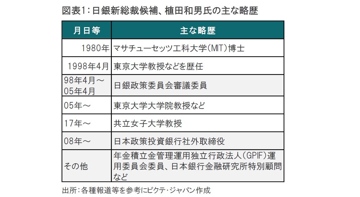 日本政府は日本銀行の黒田東彦総裁が2023年4月8日に任期を迎えることを受け、後任に経済学者で元日銀審議委員の植田和男氏を起用する人事を固めたと報道されています(図表1参照)。