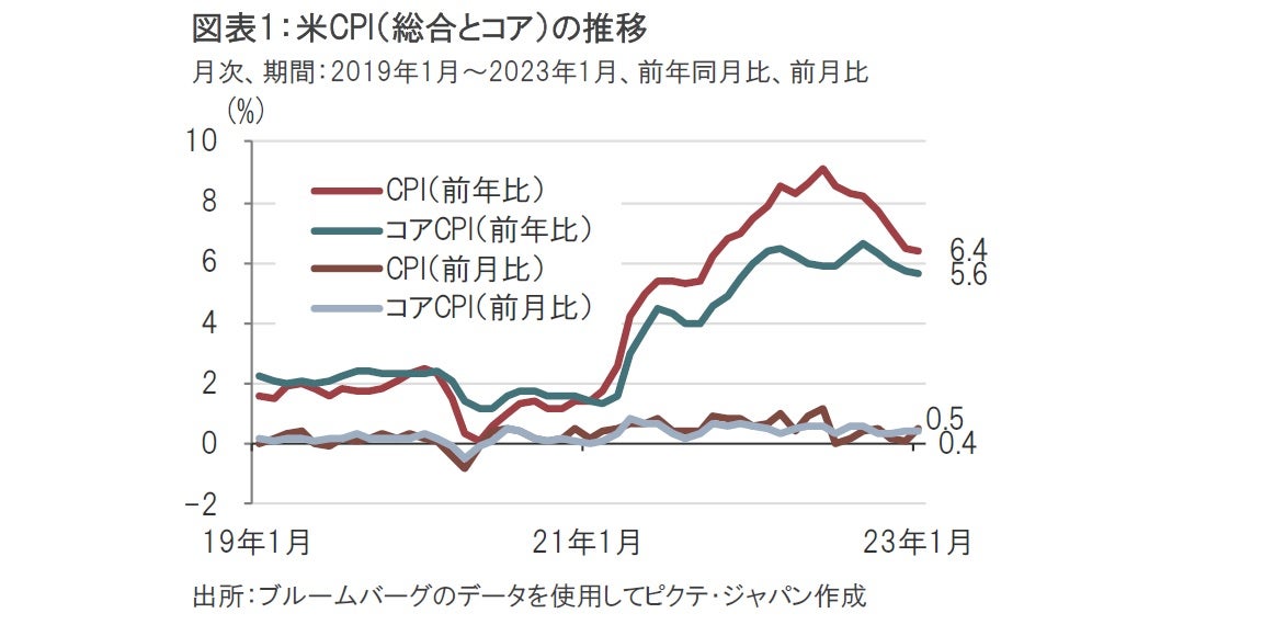 米労働省が2023年2月14日に発表した1月の消費者物価指数(CPI)は、総合CPIが前月比0.5%上昇と、市場予想に一致し、前月の0.1%上昇(速報値のマイナス0.1%低下から上方修正)を上回りました(図表1参照)。前年同月比では6.4%上昇と、前月の6.5%上昇から減速するも、市場予想の6.2%上昇を上回りました(図表1参照)。