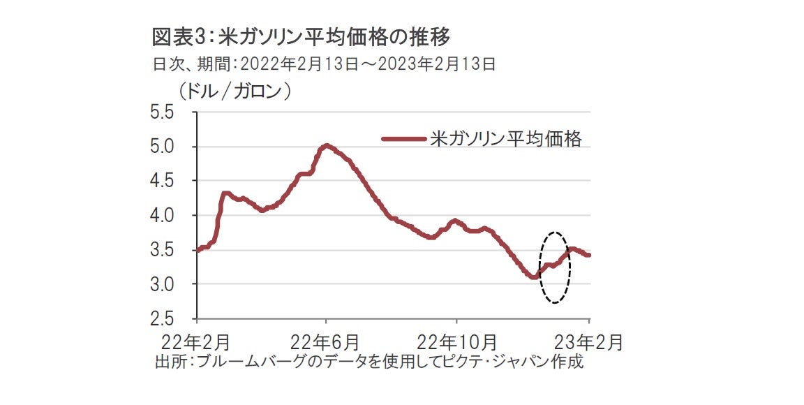 エネルギー価格は1月寄与度がプラスに転じました。その背景の1つはガソリン価格の上昇と見られます(図表3参照)。1月を通じてガソリン価格はほぼ上昇傾向となったからです。この上昇が持続性のあるものなのか、今後の展開に注意は必要です。