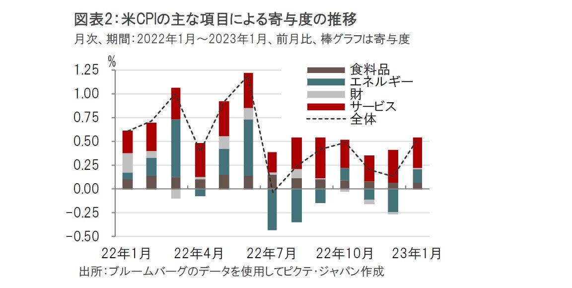 1月の米CPIはインフレ減速のペースが緩やかとなり、高水準での推移が続く結果となりました。ペースが緩やかとなった背景を前月比の変動(寄与度)で確認します(図表2参照)。