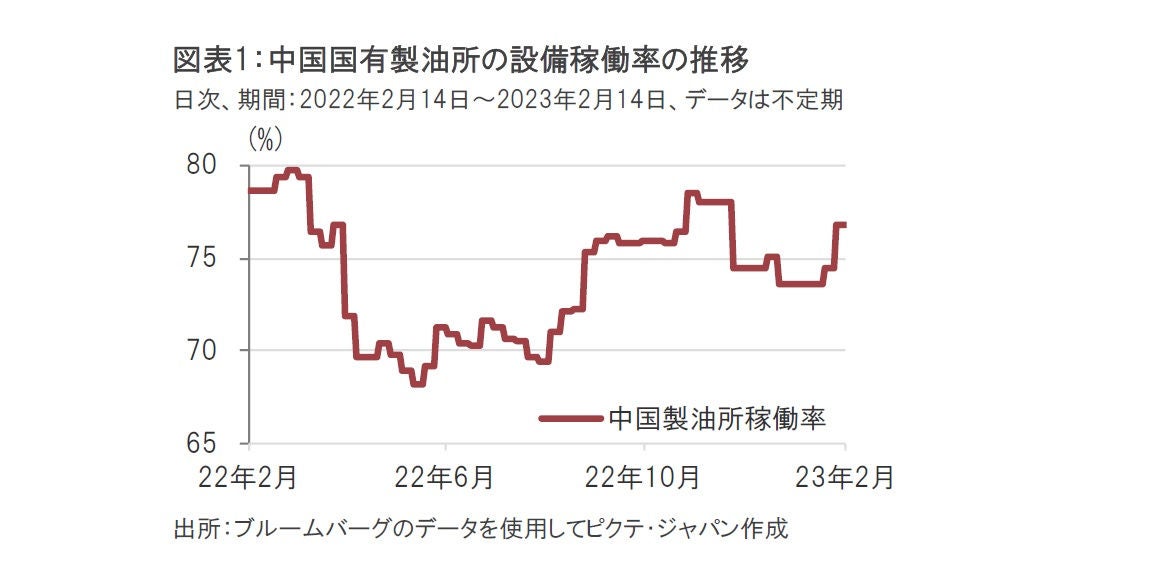 中国の石油製油所はゼロコロナ政策解除の動きを受け、石油需要の増加を見込んでいる模様です。そのため国有製油所は設備稼働率を引き上げて、想定される石油需要への対応を進めていることがデータからうかがえます(図表1参照)。