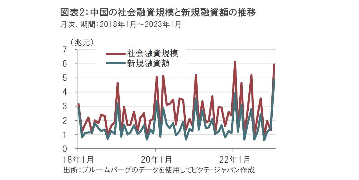 まず、金融面を確認すると、中国社会全体の資金調達状況を示唆する社会融資規模は5.98兆元増加しました(図表2参照)。借り入れを示す新規融資額は4.9兆元と昨年1月に記録した過去最大の3.98兆元を超えました。企業の借り入れ意欲が旺盛であったことが背景です。通常中国では、1月に春節休暇が重なり資金需要は高まる傾向があります。しかし、過去に比べても、資金需要が強いことから、足元の景気回復期待の強さがうかがえます。