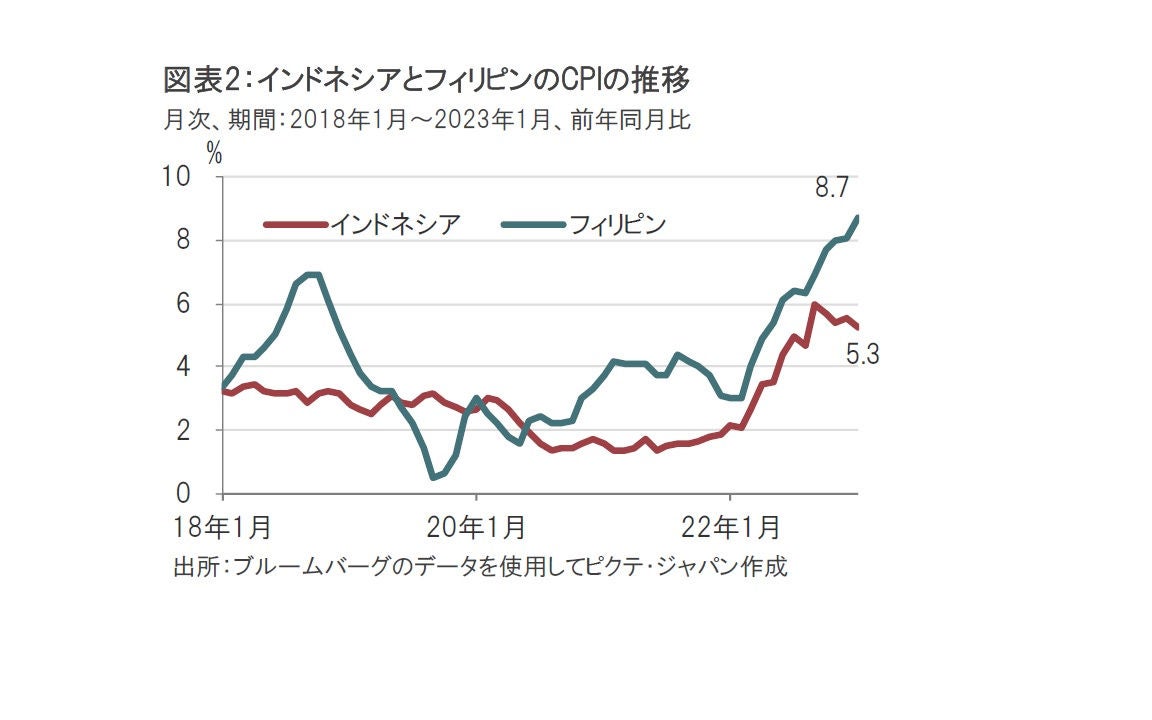 もっとも明確なのはインフレ動向の違いです。両国の消費者物価指数(CPI、図表2参照)を比べるとCPIのこれまでの「勢い」に違いがあり、インドネシアはピークアウト感がみられますが、フィリピンは上昇傾向が続いています。