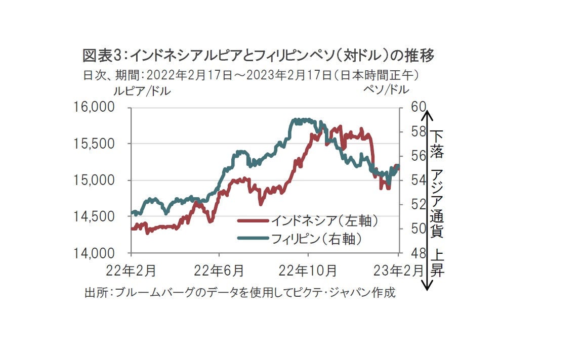 最後に、為替市場の反応を確認します。利上げ継続のフィリピンペソとともに、据え置きのインドネシアルピアの下落は小幅にとどまっています(図表3参照)。