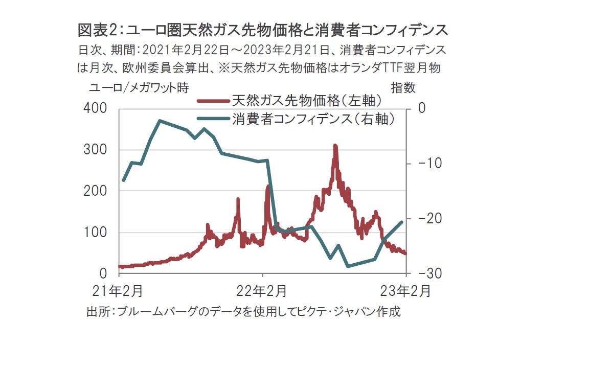 サービス業PMIの動向は消費者マインドの回復が背景にあると見られます。消費者コンフィデンス指数は昨年後半に底打ちが見られます(図表2参照)。その原動力は暖冬などを背景にした天然ガスなどエネルギー価格の落ち着きと見られます。ロシアのウクライナに対する軍事侵攻などを受け上昇していた天然ガス価格は侵攻前と同様の水準となっています。暖冬という幸運に恵まれたこと、代替エネルギー(液化天然ガス)の導入などを受け主要なエネルギーである天然ガスの価格は足元大幅に低下しています。さらにユーロ圏の天然ガス貯蔵率は足元で約63.7%(2月20日現在)と、高水準です。例年この時期は概ね30~40%に低下していることに比べ高水準の貯蔵率であることがエネルギー供給不安を後退させています。このことが、極端なインフレ懸念を緩和している可能性もあります。