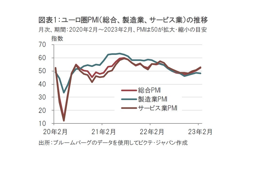 米S&Pグローバルが2023年2月21日に発表した2月のユーロ圏の購買担当者景気指数(PMI)によると、総合PMIは52.3と市場予想の50.7、前月の50.3を上回りました(図表1参照)。