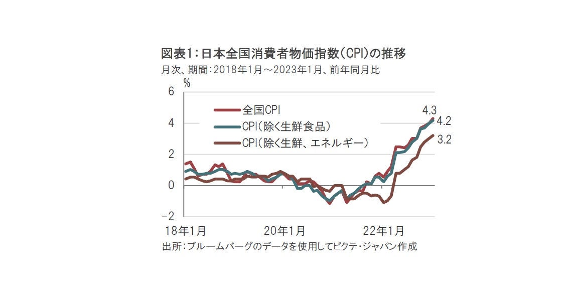 同日、総務省は1月の全国の消費者物価指数(CPI)を発表しました(図表1参照) 、日銀が重視する変動の大きい生鮮食品を除くコアCPIは前年同月比で4.2%上昇し、1981年9月(4.2%)以来、41年4カ月ぶりの上昇率となりました。生鮮食品を含む総合CPIは4.3%上昇と、81年12月(4.3%)以来、41年1カ月ぶりの上昇率でした。