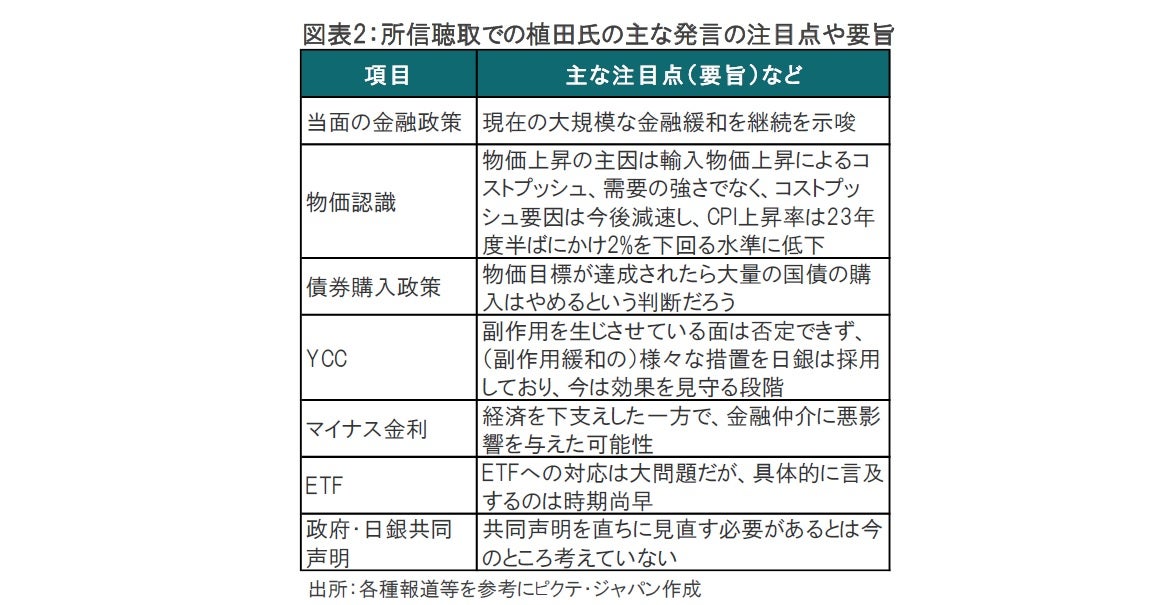 今回の所信聴取と、その後の質疑において植田氏のコメントは安全運転で、株式市場に安ど感が広がったようです。植田氏や副総裁候補両名の発言内容を振り返ると、当面は現状維持が想定されそうです(図表2参照)。これを下支えするのが物価認識でしょう。従来からの主張のくり返しながら、足元の4%を超えるインフレ率は賃金上昇を伴う物価上昇ではなく、今後低下する可能性が高いと植田氏は見ているからです。