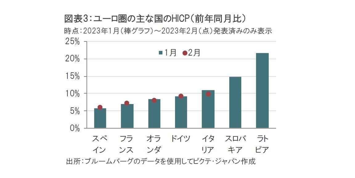 なお、ユーロ圏のインフレ率は国による違いに注意も必要です。2月の速報値は発表途中で一部の国は未発表です。そこで1月を棒グラフに、2月を発表済みの国について点で示すと、ドイツ、フランス、スペインなどは2月の数字が1月を上回っています(図表3参照)。また6%弱のスペインから、20%を超えるラトビアまで国によってインフレ率の違いが大きいのも特徴です。これはエネルギー依存度の差や、各国が実施した価格抑制政策の違いなどが国別のインフレ率の差に反映していると見ています。国によるインフレ率の違いが金融政策に与える影響にも注意が必要です。
