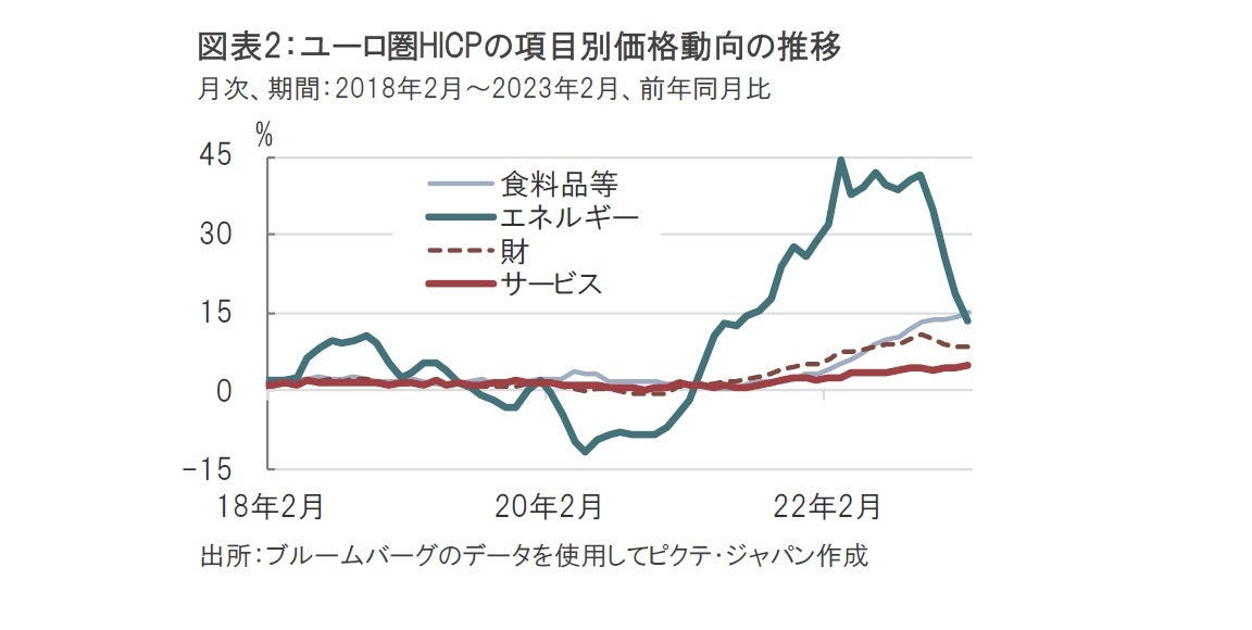 2月のユーロ圏のHICPをエネルギー、サービス、食料品、さらにテレビのように生産された財の4つの項目に分け前年同月比で推移を振り返ります(図表2参照)。まず目につくのは天然ガスなどを含むエネルギー価格の下落です。HICP減速の主な要因と見られます。しかし、食料品価格は2月が15.0%上昇し、先月の14.1%上昇を上回りました。HICPの減速が鈍った要因とみています。
