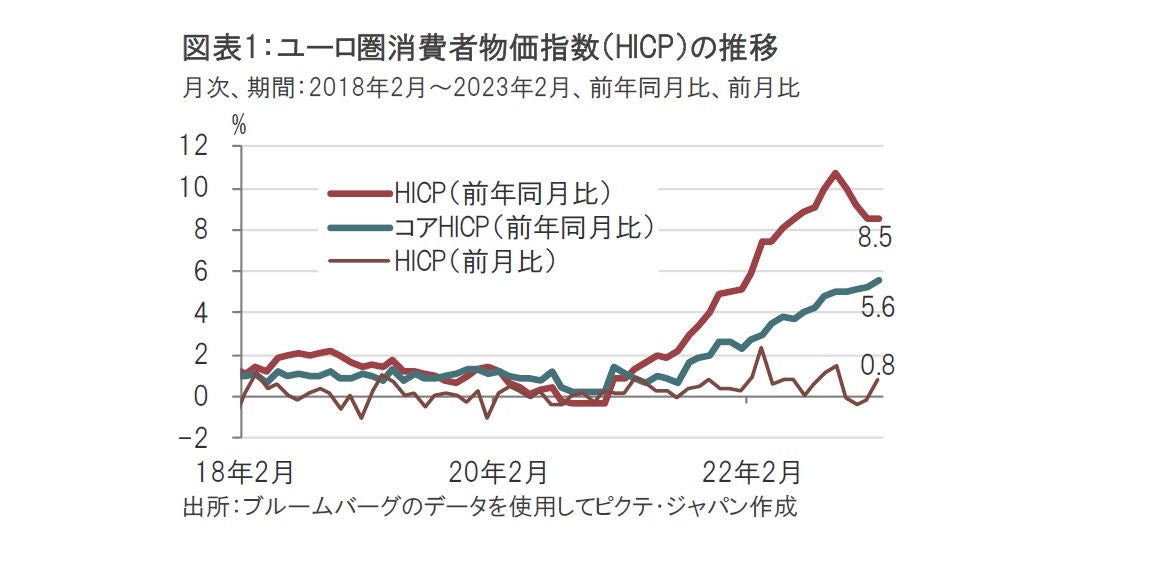 欧州連合(EU)統計局が2023年3月2日に発表した2月のユーロ圏の消費者物価指数(HICP)は前年同月比8.5%上昇と、1月の8.6%上昇を下回るも、市場予想の8.3%上昇を上回りました(図表1参照)。変動の大きい食料品やエネルギーを除いたコアインフレ率は2月が前年同月比5.6%上昇と、市場予想の5.3%上昇、1月の5.3%上昇を上回りました。