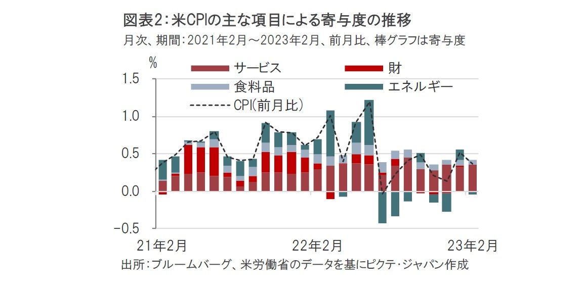 2月の米CPIは全体的にはインフレ鈍化傾向ながら、コアCPIの前月比の伸びは先月を上回りました。インフレ率は依然高水準で、利上げ継続も想定されますが、米地銀の破綻など利上げの副作用も懸念されます。このような時だからこそ、物価動向の内容を確認するこが大切であると考えます。そこで米CPIの前月比の変動要因を寄与度で振り返ります(図表2参照)。