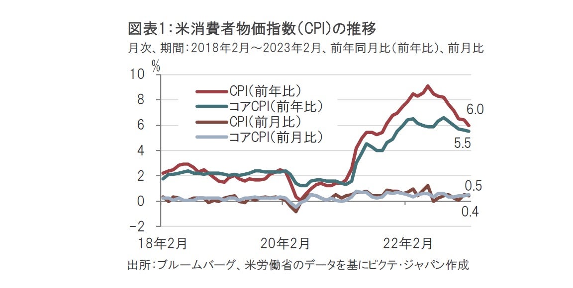 2月の米CPIは前年同月比で6.0%上昇と、市場予想と一致しました。前月は6.4%上昇となり、昨年6月の9.1%上昇をピークに8カ月連続で鈍化しています。一方でコアCPIは2月が前年同月比で5.5%上昇と、前月の5.6%上昇から小幅な減速にとどまっています。全体的にはインフレ鈍化と言えなくもありませんが、物価下落のペースは、これまでのところ緩やかなペースとなっています。