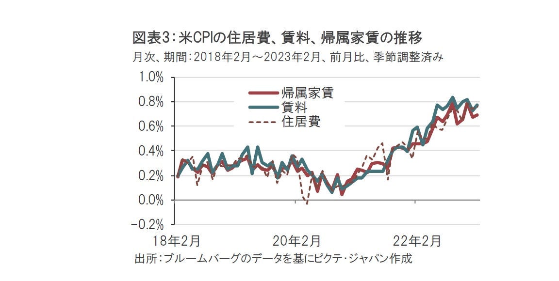 やはり、最大の寄与項目はサービスで、その価格動向が米CPIを左右しています。そのうえ、サービス価格の大半は賃料や、持ち家を家賃換算した帰属家賃が主要な構成項目である住居費で占められています(図表3参照)。2月の住居費CPIは前月比で0.8%上昇と、1月の0.7%上昇から加速しています。ただし、賃料のうち、新規の賃貸契約のみで構成された賃料の指数はすでに下落傾向です。賃料全体の価格動向も下落が見込まれています。ピクテでは23年前半(おそらく4-6月期)に住居費はピークを迎えると見ています。