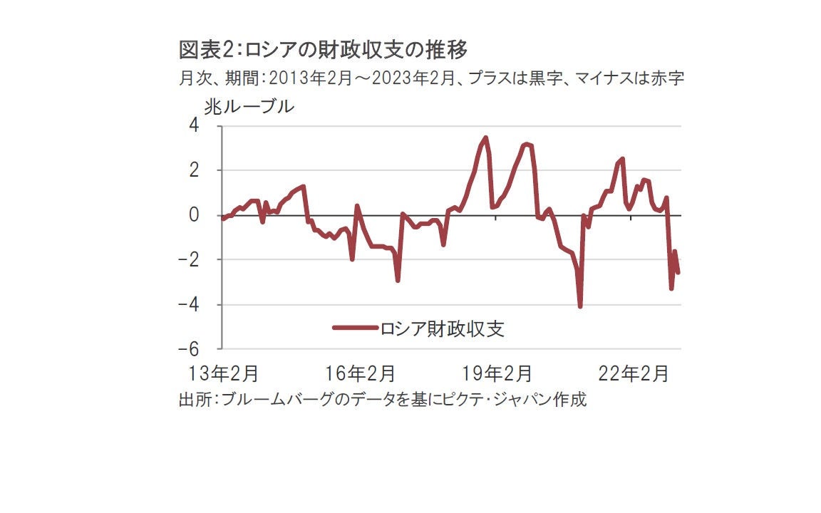 ロシアとウクライナの紛争は不幸にして1年を超えています。欧米を中心にウクライナへの軍事支援のみならず、ロシアに経済制裁を行ってきましたが、効果には不透明な面も見られます。ただし、ロシアの財政を見ると、足元で財政赤字が拡大するなど悪化の兆しも見られます。ロシアとウクライナの紛争の今後の展開は読めませんが、1日も早い終結を祈るばかりです。