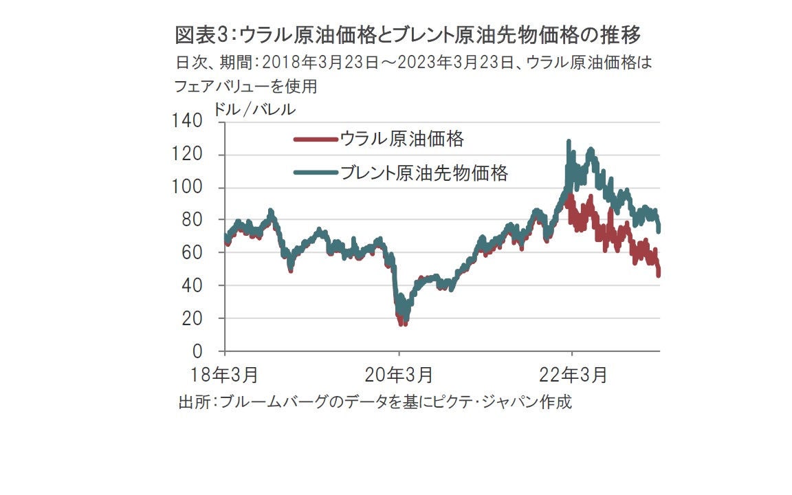そして足元では両指標の価格差が拡大する傾向が見られます。その背景とみられるのがロシア産原油に対する上限価格の設定措置です。22年12月、欧州連合やG7、オーストラリアはロシア産原油の国際的な取引価格の上限価格を1バレル=60ドルに設定する制裁措置を導入しましたが、この措置に一定の効果があったように思われます。他の政策も合わせ、徐々に効果が出始めたのかもしれません。