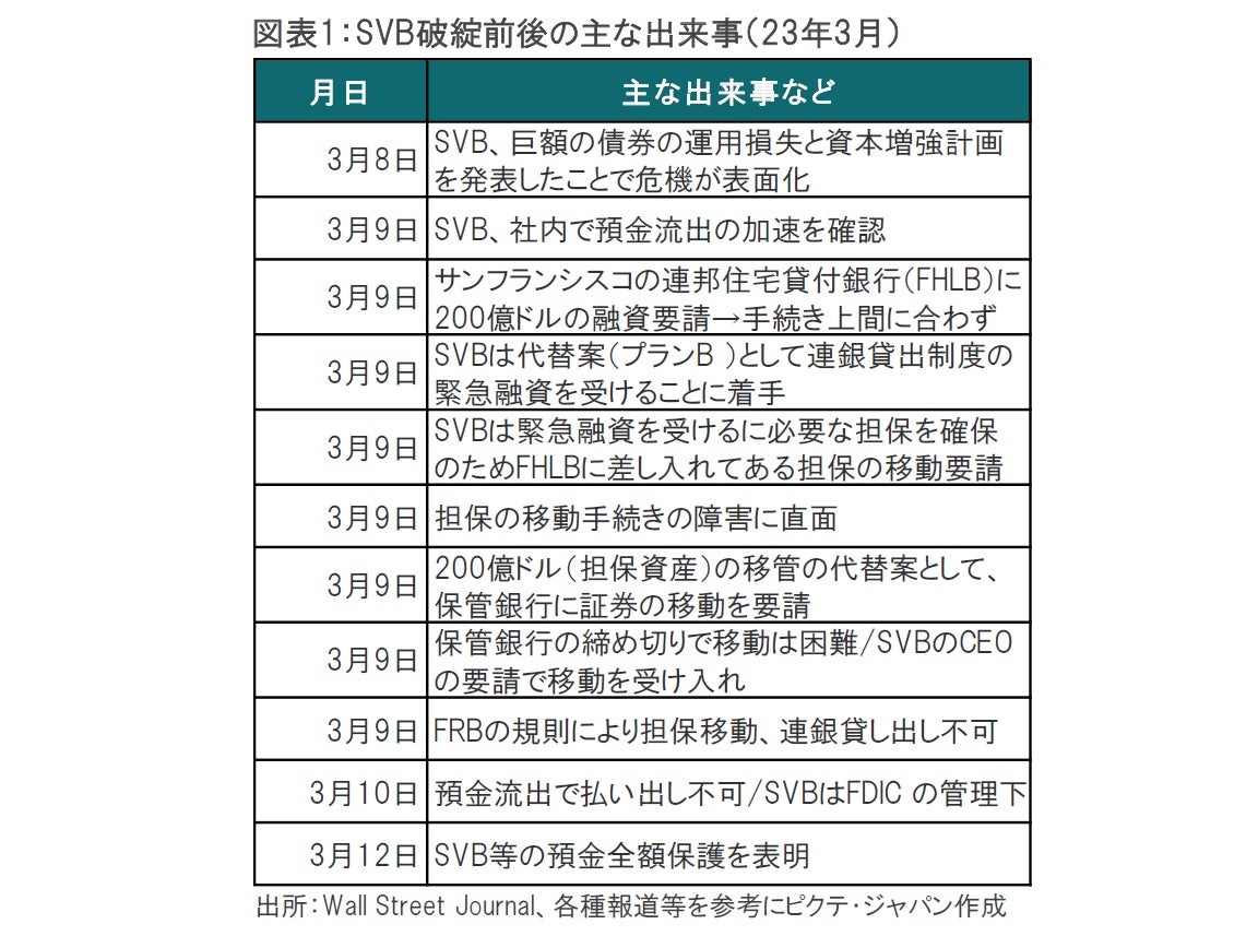 金融監督の強化が求められることは当然のことながら一方で、SVB破綻の経緯を振り返ると、機動性の確保も求められるように思われます。米大手新聞がSVB破綻に至るまでの流れを報道しています。図表1はその報道を基に作成したものです。SVBの問題は3月8日に表面化しました。債券損失と資本増強計画が発表されたからです。しかしSVBの株価推移から見て、表明前からSVBの経営状況は悪化していたと思われます。預金流出は、表明前後から加速していたものと見られます。