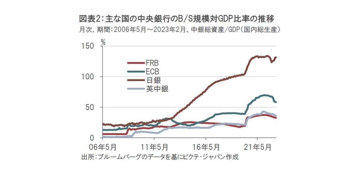 ユーロ圏のインフレ率を高止まりさせる可能性として別の要因に、量的金融緩和(QE)政策により購入した債券で肥大化した中央銀行のバランスシート(B/S)の規模が挙げられます。これが利上げ効果を抑制する可能性が指摘されています(図表2参照)。例えば、ECBのシュナーベル理事は最近もECBのB/S規模は効率的な金融政策を実行する上で不必要に大きいと指摘しています。