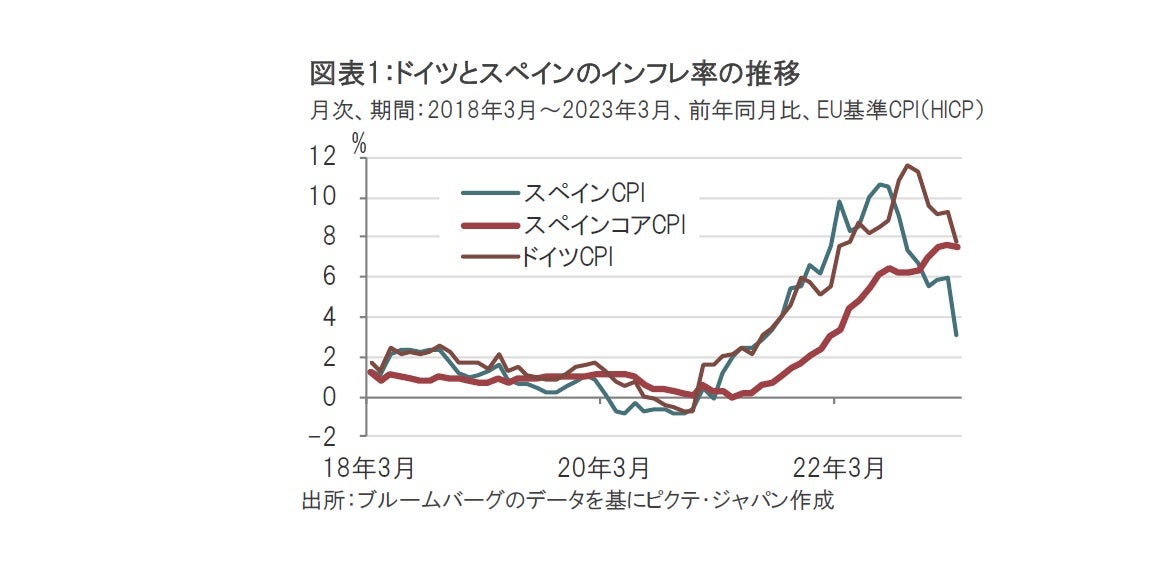 2023年3月30日に発表された3月のドイツの消費者物価指数(CPI、速報値)は、欧州連合(EU)基準で前年同月比7.8%上昇と、市場予想の7.5%上昇を上回りました(図表1参照)。2月は9.3%上昇でした。同日発表されたスペインの3月のCPIは前年同月比で3.1%上昇と、市場予想の3.7%上昇、2月の6%上昇を大幅に下回りました。