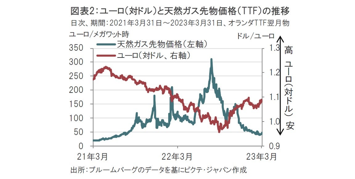 ユーロ圏の3月のHICPが前年同月比6.9%と上昇率が鈍化した背景はエネルギー価格が下落に転じたため、というのは図表1からも明らかです。エネルギー価格下落の理由は欧州で主要なエネルギーである天然ガス価格が急落したからで(図表2参照)、ロシアがウクライナに軍事侵攻する前の水準にまで低下しています。