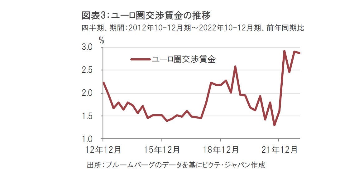 今後のサービス価格の展開を左右する要因は賃金動向と見ています。ユーロ圏の労働市場も概ね堅調で、ユーロ圏の賃金動向の目安の一つである交渉賃金は22年10-12月期が前年同期比で2.9%上昇と底堅い推移となっています(図表3参照)。3月のHICPが減速したとはいえ、水準は依然高いままです。実質賃金の伸び率はマイナスと見られ、購買力を維持するためにも賃上げ圧力は根強いと思われます。