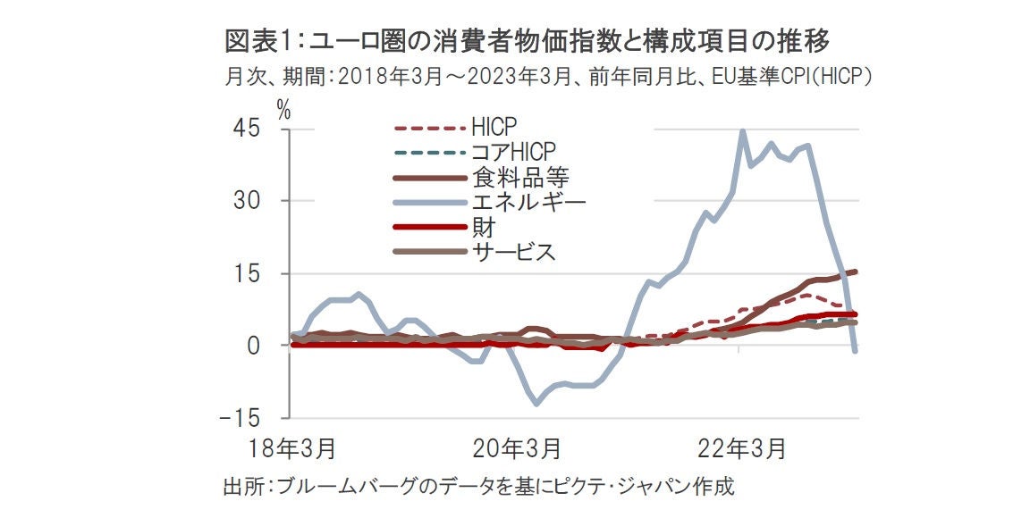 欧州連合(EU)統計局が2023年3月31日に発表した3月のユーロ圏の消費者物価指数(HICP)は前年同月比6.9%上昇と、市場予想の7.1%上昇、前月の8.5%上昇を下回りました(図表1参照)。