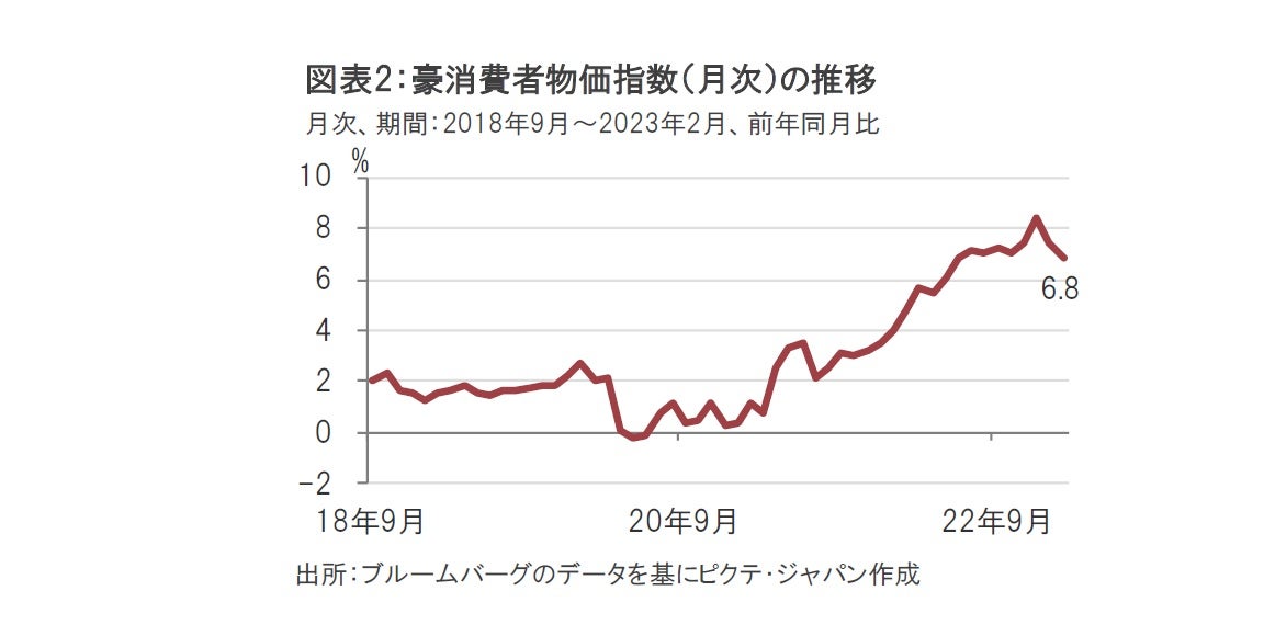 次に、豪インフレ率についてはピークを付けた可能性が高く、財価格は海外情勢および内需の弱まりを背景に今後数ヵ月間鈍化するとの見通しを述べています。なお、豪統計局が3月29日に発表した2月の消費者物価指数(CPI)は前年同月比6.8%上昇と、前月の7.4%上昇から鈍化し、市場予想の7.2%も下回りました(図表2参照)。豪物価統計は四半期ベースのCPIが重視されますが、4月26日に月次、四半期ベースが共に発表される予定です。金融政策を占ううえで、改めて物価動向を確認する必要があります。