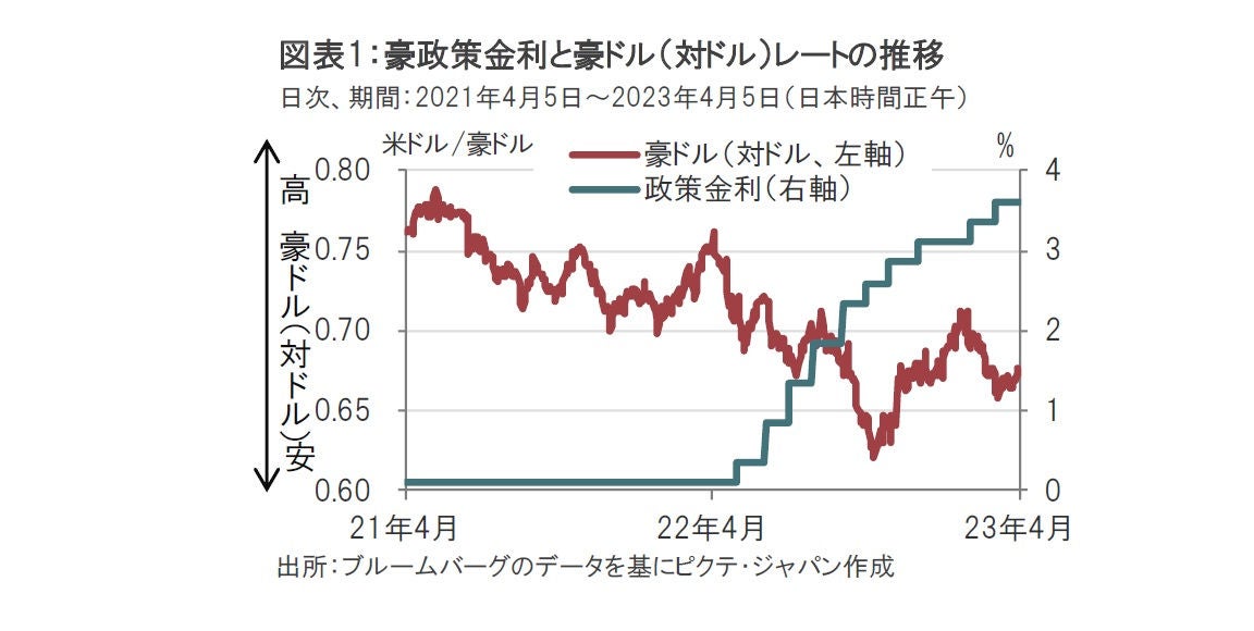 オーストラリア(豪)準備銀行(中央銀行)は2023年4月4日の理事会で、過半の市場予想通り政策金利を3.6%に据え置くことを決定しました(図表1参照)。豪中銀は昨年5月に金利を0.25%上げた後、3月まで10会合連続、合計3.5%、政策金利を引き上げてきました。豪中銀は声明文で「これまでの金利上昇の影響と経済見通しを評価するための時間を確保」するため据え置きを決めたと説明しています。