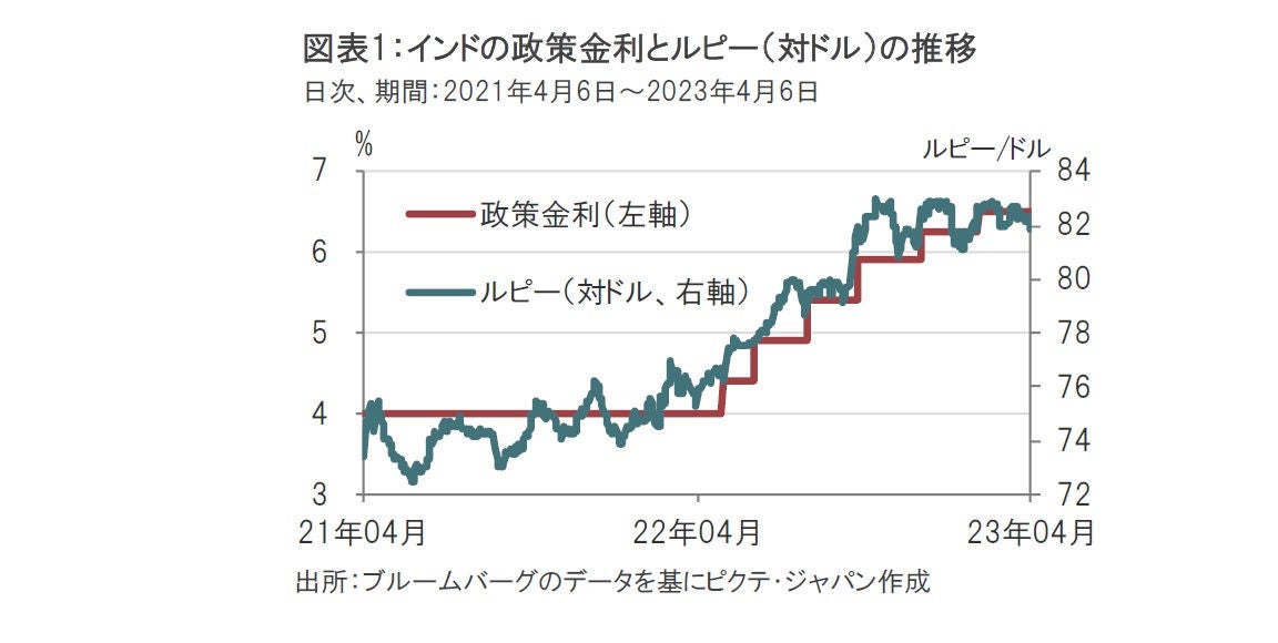 インド準備銀行(中央銀行)は2023年4月6日、政策金利を据え置くことを決定し(図表1参照)、政策金利のレポ金利を6.50%で維持しました。市場の大半が0.25%の利上げを予想していましたが、インドの金融政策委員会はメンバー(6人)の全会一致で据え置きを決定しました。
