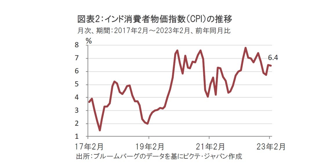 インド中銀は22年5月から6会合連続の利上げで累計の利上げ幅は2.5%となっていました。過去の本格的な利上げ局面での累計利上げ幅に比べ、仮にここで利上げ終了となれば、早めという印象です。また消費者物価指数(CPI)を見ると、2月が前年同月比で6.4%上昇と(図表2参照)、インド中銀の物価目標(4%±2%)の上限6%を上回っている中での停止に意外感はあったと思われます。