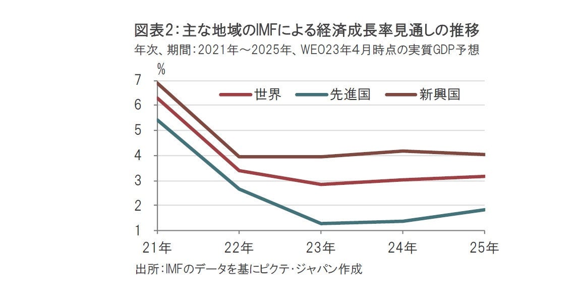 図表1に示したIMFの経済成長率見通しはメインシナリオに基づいて予測されています。その主な前提として、先月発生した金融不安は概ねコントロールされ世界景気に深刻な影響を及ぼさず、世界的な景気後退は回避されるとしています。また、コモディティ価格は需要後退を反映して下落基調が想定されています。例えば原油価格は今年は24%、24年は5.8%の下落を前提としています。なお、政策金利は、インフレが想定より長期化しているため、昨年10月時点のWEOにおける想定より引き締め気味を前提としています。
