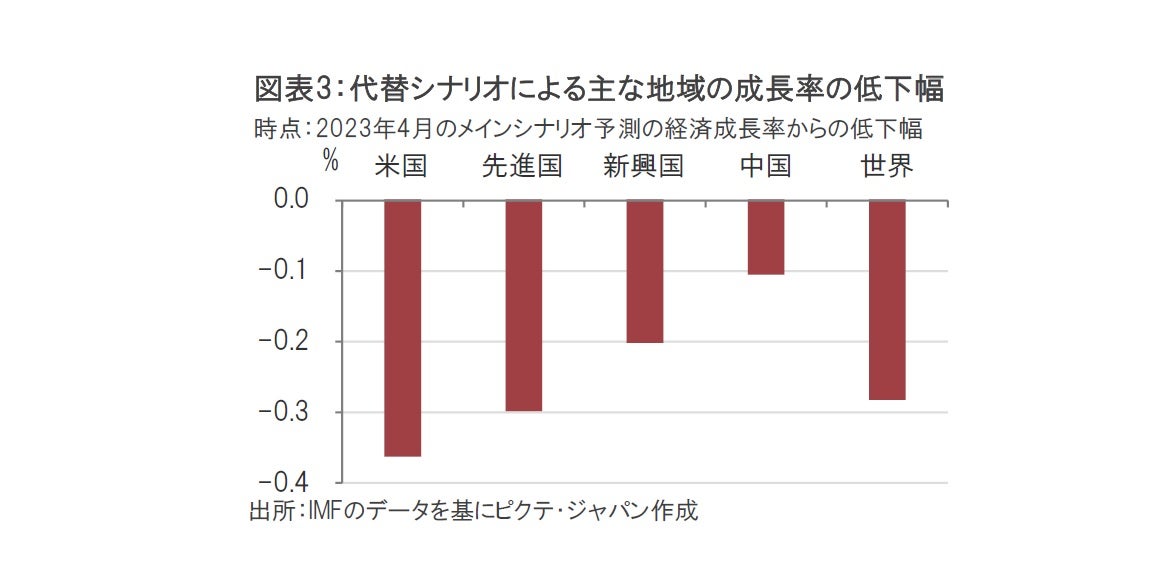 一方で、WEOは金融不安をある程度の悪化を起こしうる(代替)シナリオも示しています。そのシナリオの前提としてIMFは、金融ストレスや金融規制の強化による銀行の貸出し抑制、信用スプレッド拡大などによる金融引き締め効果の成長率抑制などを挙げています。その程度を、メインシナリオからの低下幅で見ると(図表3参照)、世界経済全体では23年の成長率見通しはメインシナリオの2.8%から概ね0.3%低い約2.5%に低下するとIMFは説明しています。このように図表3を見ると、金融不安の影響は米国などに大きく、中国など新興国への影響は相対的に低く見積もられていることがわかります。