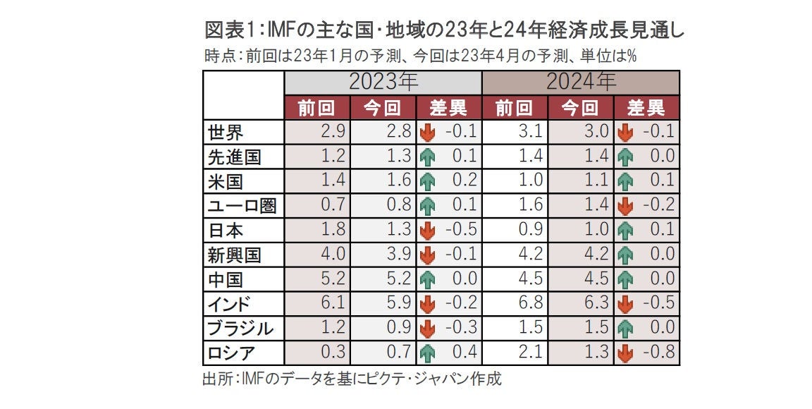 国際通貨基金(IMF)は2023年4月11日、最新の世界経済見通し(WEO)を発表しました(図表1参照)。23年の世界経済成長率を2.8%と、前回1月の見通しから0.1%引き下げました。金融不安による金融引き締めがロシアのウクライナ侵攻などの悪材料に上乗せされたと説明しています。IMFは24年の世界経済成長率見通しも前回から0.1%引き下げました。インフレ鈍化や中国の経済再開を背景に小幅ながら上方修正した前回から、一転して景気に対し慎重な見方となっています。