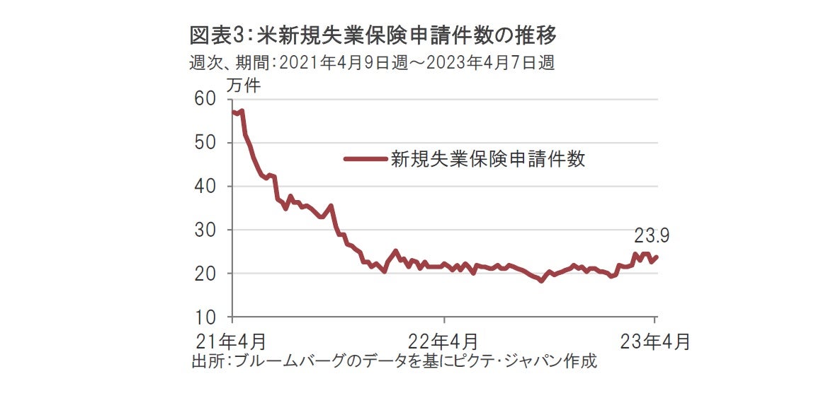 今後の展開で興味深いのは新規失業保険申請件数データです。先週は23.9万件と、その前の週の22.8万件から増加しています(図表3参照)。もっとも、コロナ禍前の10年間の平均が30万件程度であったことから見て、新規失業申請の件数はまだ低水準であり、米労働市場は堅調とも見られます。足元ジワリと件数が増えてはいますが、心配する水準とは言い難いかもしれません。
