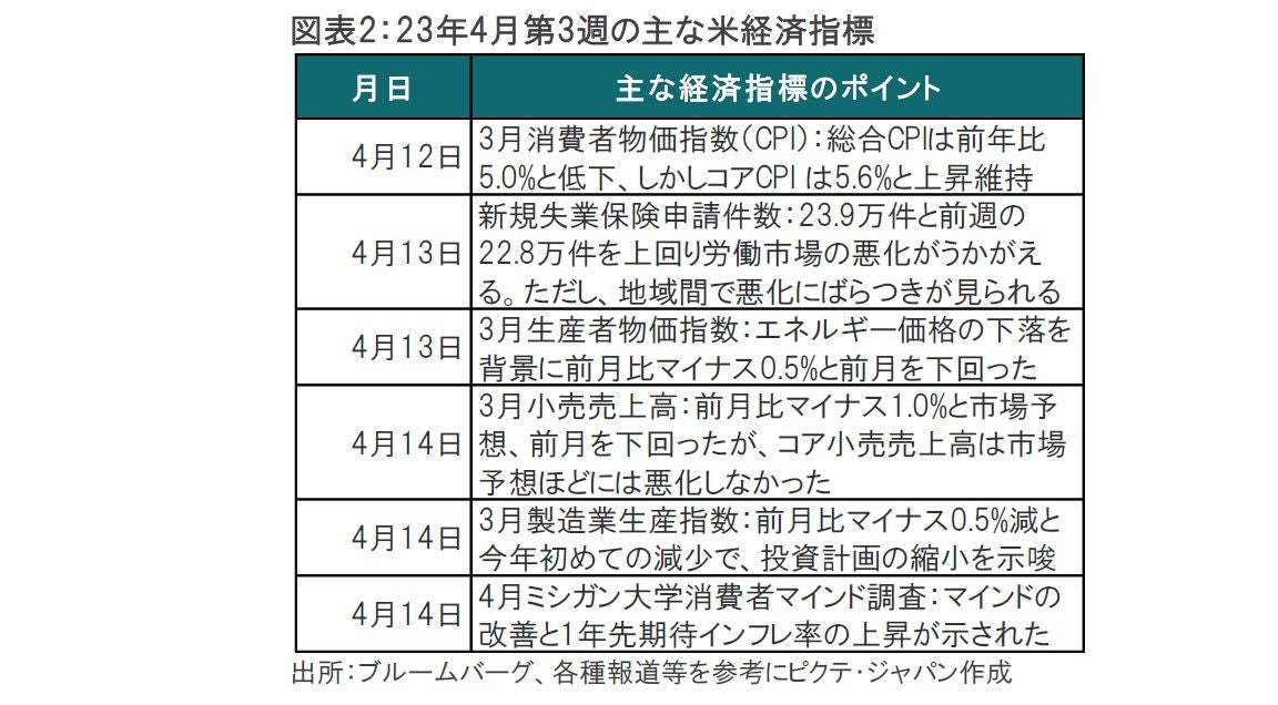 4月第3週(9日~15日)に発表された米国経済指標の内容はまちまちながら、金融不安に対しやや落ち着きがみられる一方で、インフレ懸念は依然根強いことがうかがえます(図表2参照)。4月第3週に米国債利回りが上昇傾向であったことと整合的です。今後の米国景気の悪化は見込まれますが、市場が一時織り込んでいた、7月からの利下げ開始や、年内合計で1%の利下げ観測は過大であったと市場では修正されつつあるようです。