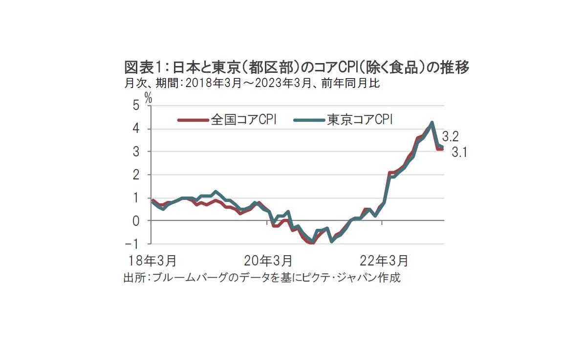 日本の全国消費者物価指数(CPI)は日銀が参照する生鮮食品を除いたコアCPIベースで3月分は前年同月比で3.1%となるなど、物価目標の目安である2%を上回っています(図表1参照)。植田総裁は24日に日本の物価の先行きについて、輸入物価の国内物価への転嫁はそろそろピークを迎え、物価上昇率は除く生鮮食品とエネルギーのベースでも23年度後半には2%を下回るという見解を示し、その見通しに沿って金融緩和政策の継続を示唆しました。