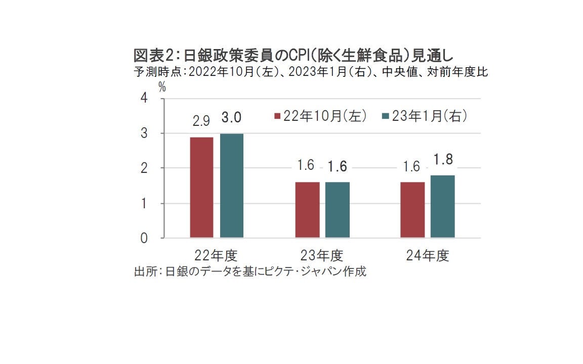 そこで日銀のこれまでの物価見通しを23年1月の「経済・物価情勢の展望」で確認すると(図表2参照)、23年度のインフレ率の水準は植田総裁の国会答弁とおおむね沿うと思われます。なお、4月28日には新たな経済・物価情勢の展望が発表される予定で、今回は25年度の見通しも示されます。事前の観測報道では、25年度についても日銀は2%に近いインフレ率を見込んでいるようです。しかし、植田総裁の答弁のポイントは、YCCの見直しをするには物価見通しが2%前後になり、加えてその見通しの確度が高まったと認識できるとき、と指摘しています。単に数字が条件をクリアするだけでなく、その中身も問われることとなりそうです。おそらく具体的には賃金上昇などがある程度継続的に見込めることなどが念頭にあるものと思われます。その意味で、植田総裁の会見で、物価の中身についてどのように考えているのかに、注目が集まりそうです。