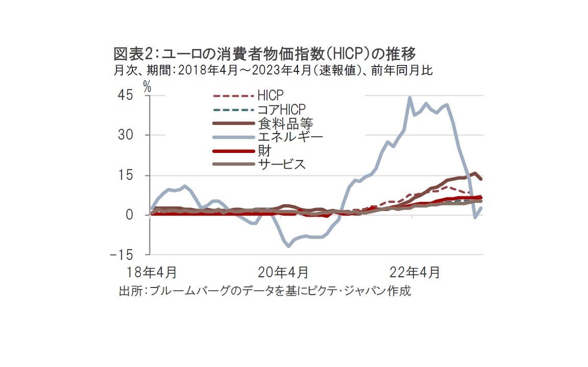 ユーロ圏のインフレ動向に警戒スタンスを維持しています。月初に発表されたユーロ圏の4月の消費者物価指数(HICP)は変動項目を除いた基調インフレであるコアHICPは4月が前年同月比5.6%上昇と前月の5.7%上昇を下回りました(図表2参照)。しかしラガルド総裁は基調インフレは依然として高いと引き締め姿勢をゆるめませんでした。