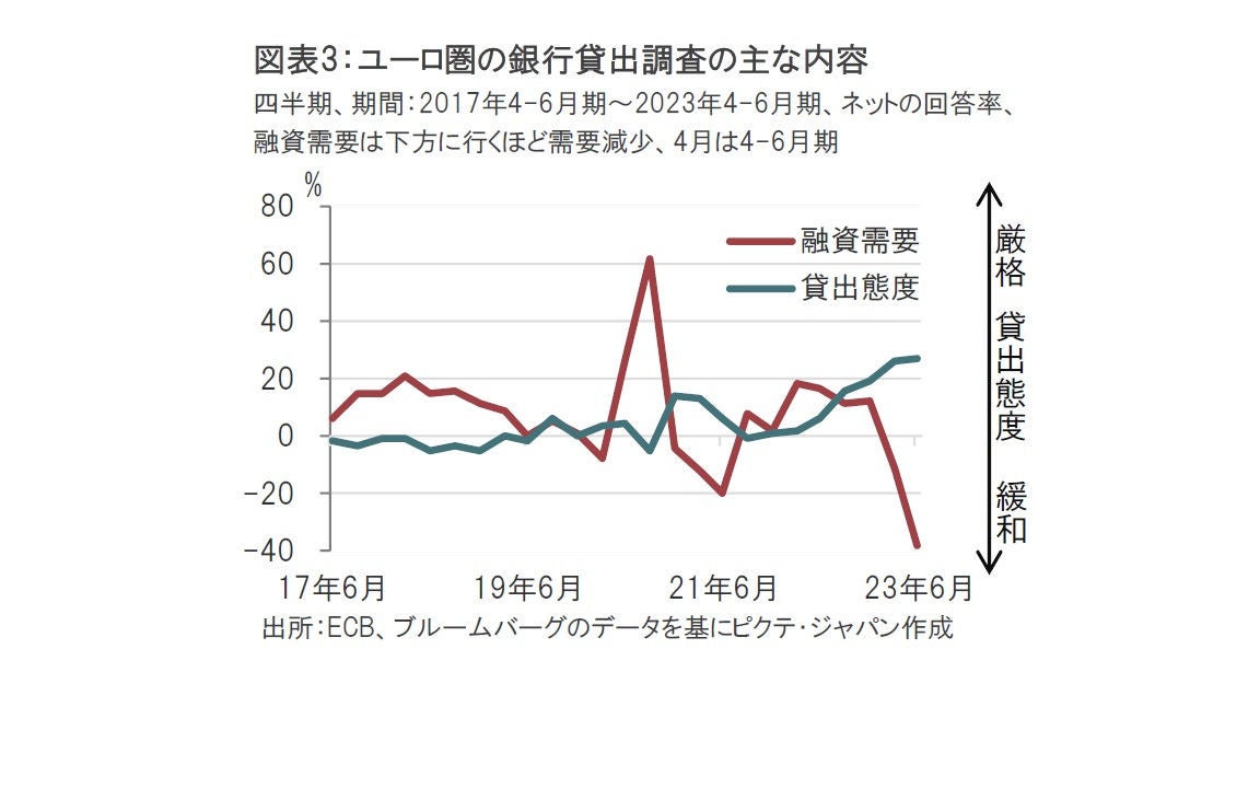 この点をECBの4月の銀行貸出調査で確認すると、ユーロ圏の貸出態度が前回より厳格化していることがうかがえます(図表3参照)。厳格化し始めた時期は概ねECBが利上げを開始(昨年7月)した頃と重なります。また、足元では金融不安が貸出態度に影響する可能性も考えられます。ユーロ圏の金融不安は米国ほどではないとの見方もできますが、今後の展開に注意は必要です。
