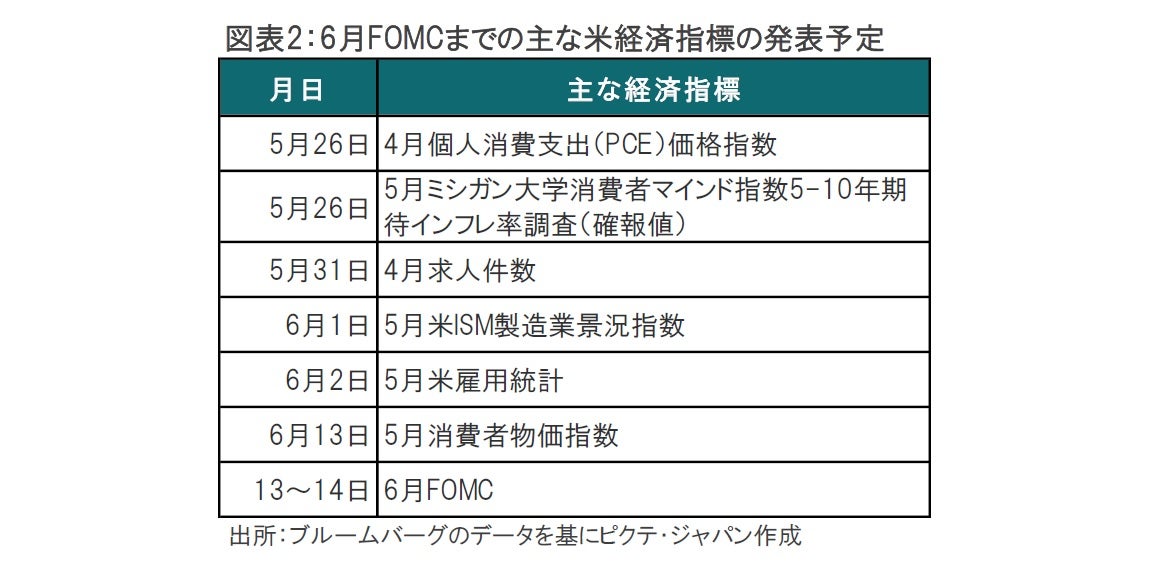 6月の米連邦公開市場委員会(FOMC)は6月13~14日開催予定です。FOMC参加者が公式に金融政策に対する発言を控えるブラックアウト期間は6月3日開始となります。5月の議事要旨からFOMC参加者の今後の政策方針に意見の違いが見られます。ブラックアウト期間前の発言も収束していませんが、今後の経済指標の発表を受け、徐々にコンセンサスが形成される流れを想定しています。