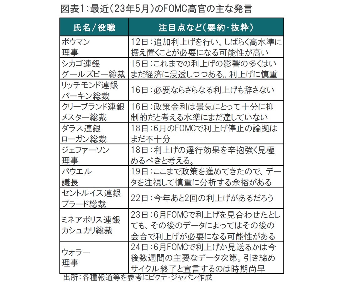 パウエル議長の19日の発言を受け、6月のFOMCでは据え置きという印象が広まりましたが、よくよく考えると、データを時間をかけてみたいという点では③の再利上げの可能性も捨てていない考えに近いのかもしれません。そもそも、①~③のグループ分けは、データ次第で6月のFOMCで支持する結果が変わる可能性もあります。むしろ大切なのは、6月のFOMCまで3週間ほど残されていることから今後のデータが6月のFOMCにおける最終判断を左右すると思われます。