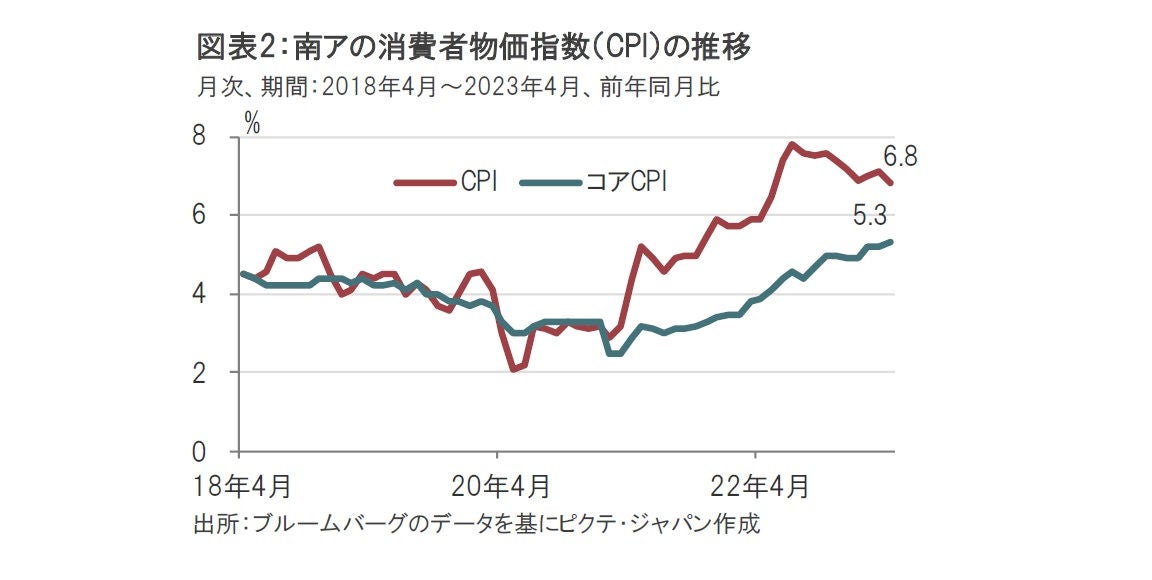 南アのインフレ動向を消費者物価指数(CPI)で確認すると、4月の総合CPIは前年同月比で6.8%上昇、エネルギーなど変動の大きい項目を除外したコアCPIは5.3%上昇となっています(図表2参照)。南ア中銀の物価目標は3-6%であり、CPIにピークアウト感は見られますが、上限を超えています。