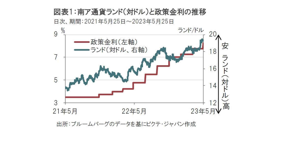 南アフリカ準備銀行(中央銀行)は2023年5月25日に金融政策委員会(MPC)が政策金利を7.75%から8.25%に引き上げたと発表しました(図表1参照)。利上げ幅は市場予想通りでした。