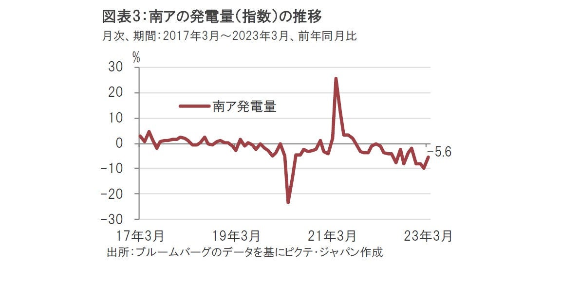 通貨ランドの下落から、何が不十分なのかを改めて考えると、金利市場では一段の利上げを見込んでいるとみられますが、今後の過度な利上げは見込まれていないようです。ランド安の原因は電力不足など別の要因が大きいと見られます。南アの発電量を見ると前年比でマイナスが続いています(図表3参照)。南ア中銀の声明文でも様々なインフレ要因を指摘する中、明確なリスクとして電力不足による電力価格上昇などを指摘しています。