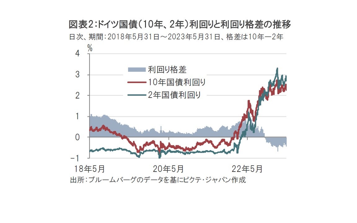 なお、ドイツなど一部の国ながら、ユーロ圏においても全般に金利が上昇するなか、昨年後半から長期金利が短期金利を下回る逆イールドとなっています(図表2参照)。逆イールドは資金の短期調達、長期運用を基本とする銀行などの収益にマイナスに作用するため、収益悪化の目安と考えられます。米国で破綻した銀行は金利上昇が保有債券の評価損を拡大させたことや、預金流出が破綻の引き金となりました。金融安定性レビューは、ユーロ圏の銀行の債券保有割合が相対的に低いことから影響は小幅と説明しています。