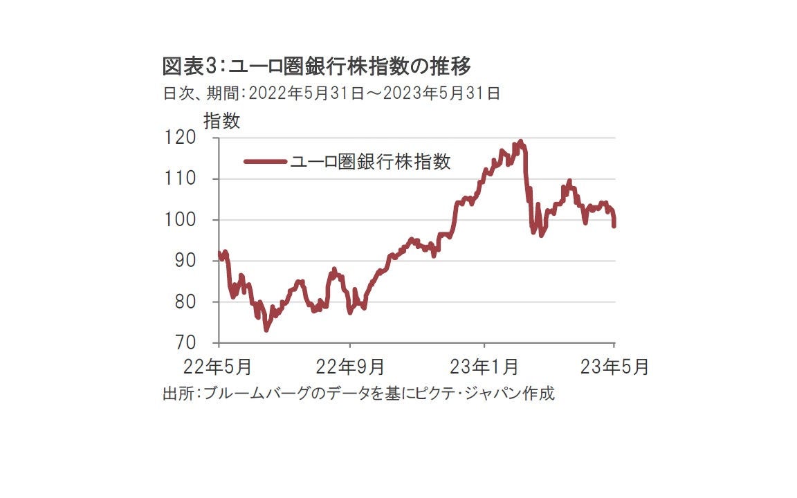 ユーロ圏の銀行における金利上昇の影響をユーロ圏銀行株指数(ユーロストックスの銀行株指数)により振り返ると、昨年秋から銀行株指数は金利上昇が銀行収益を改善するとの期待、昨年末から3月まではユーロ圏の景気回復期待を受け大幅に上昇しました(図表3参照)。しかし今年3月以降は金融不安や景気回復期待の鈍化などで銀行株指数は下落傾向です。
