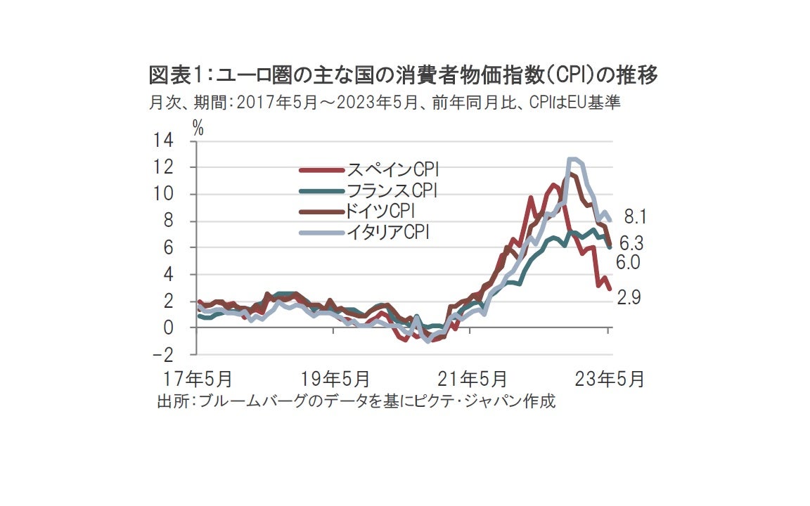 ドイツ連邦統計庁が2023年5月31日に発表した5月の消費者物価指数(CPIまたはHICP、速報値)は欧州連合(EU)基準で前年同月比6.3%上昇と、市場予想の6.7%上昇、前月の7.6%上昇を下回りました(図表1参照)。同日にはフランス、イタリアの5月のCPIも発表され、前年同月比で各々6.0%上昇、8.1%上昇となりました。