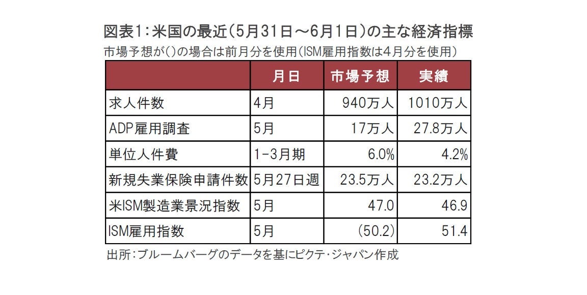 6月の米連邦公開市場委員会(FOMC)を前に、金融政策について発言を控えるブラックアウト期間は6月3日に始まります。5月の雇用統計や消費者物価指数などを参考に、FOMC参加者はぎりぎりまで金融政策の判断を迫られると思われます。なお、足元で発表された経済指標は解釈に時間が必要なものも見られます。FOMCにおいても、そのような選択肢が支持される可能性も考えられそうです。