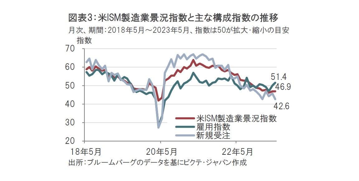 景況感を米ISM製造業景況指数でみると、5月は46.9と前月を下回り減速傾向です(図表3参照)。もっとも米国経済はサービスセクターのウェイトも大きいことから後日発表されるISM非製造業景況指数も確認する必要はありますが、利上げなどを背景に設備投資が軟調なことから、製造業の先行きは回復が鈍そうです。先行指標となる傾向がある新規受注が42.6と低下したことも気がかりです。しかし、雇用指数は51.4と前月を上回り底堅さを示しています。